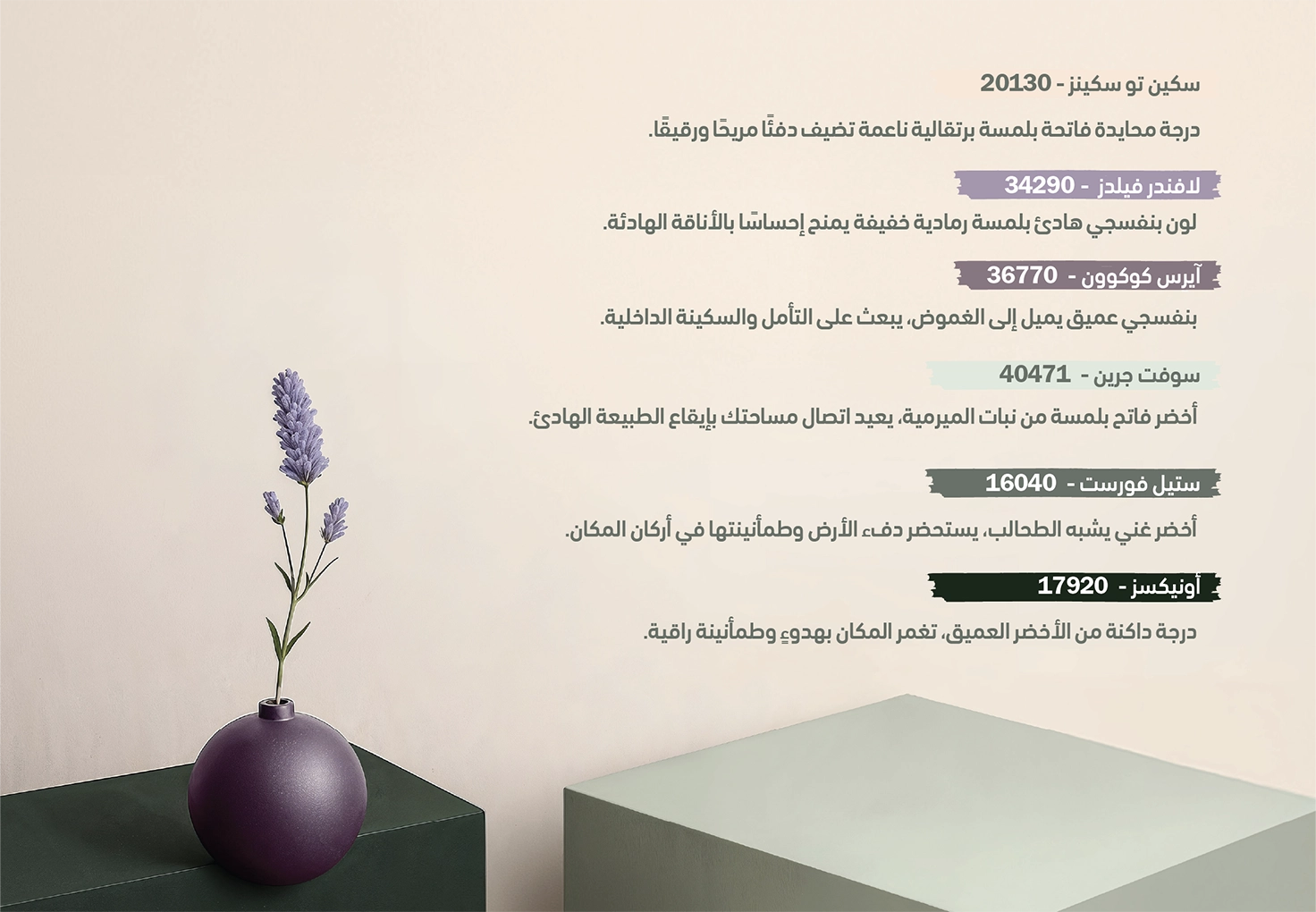 من درجات البنفسجي الناعم والأخضر الهادئ إلى الألوان المحايدة المتوازنة.