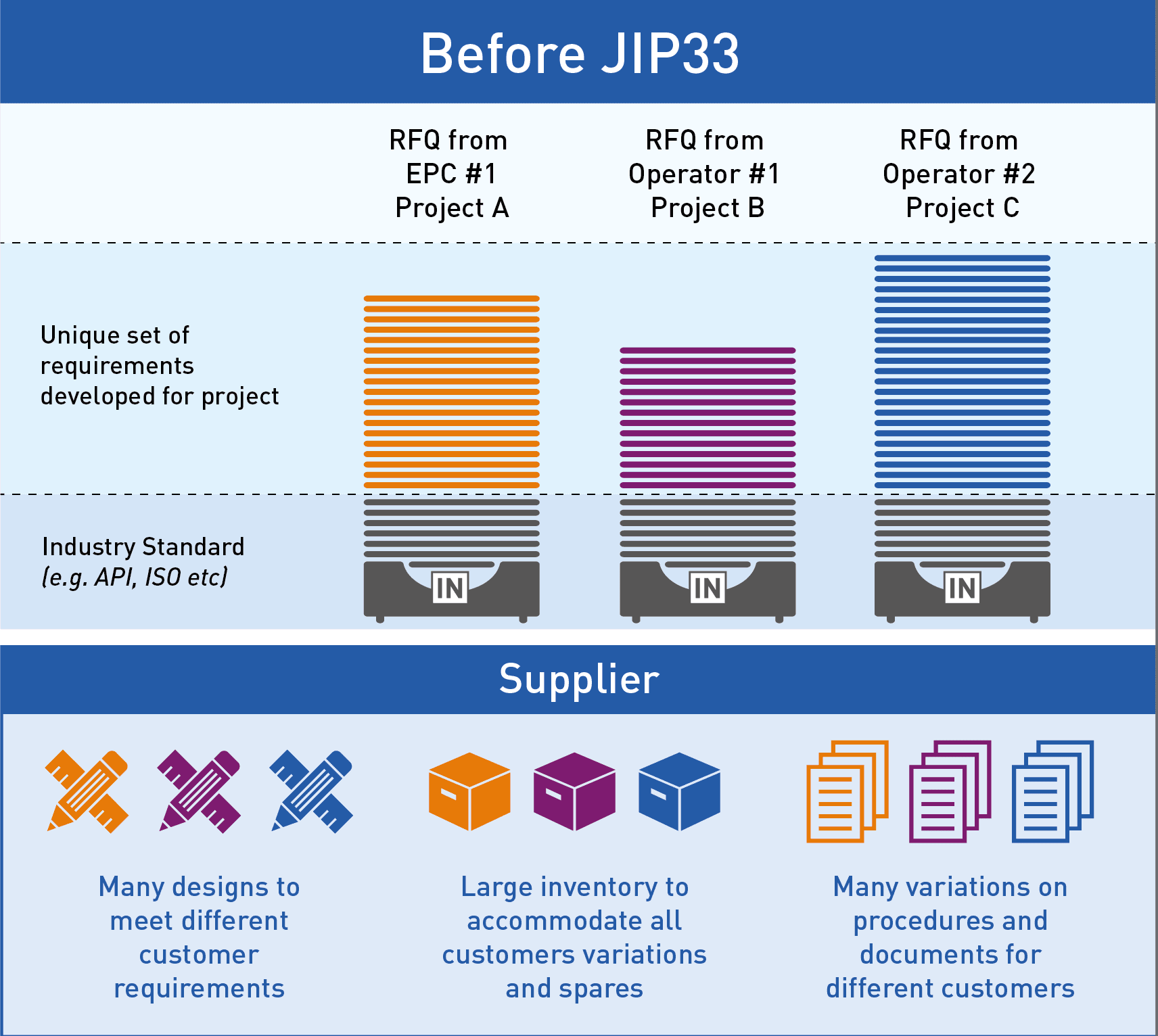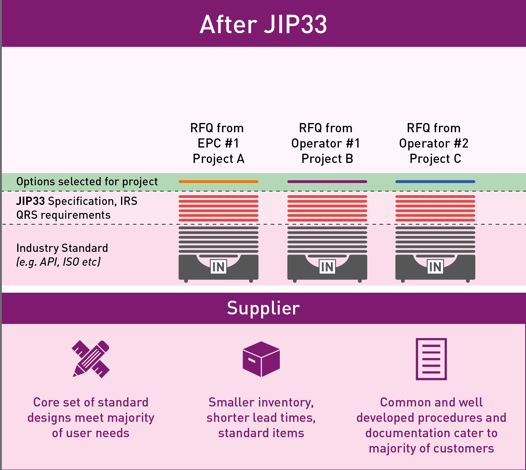 The document was an output from the Association’s Joint Industry Project 33: Standardising Procurement Specifications, the objective of which was to make a step-change improvement in the specification, procurement and delivery of equipment for the oil and gas industry through the use of standardised procurement specifications (see figure below).