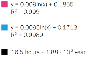 The test results are extrapolated to demonstrate that the applied load will not cause displacement of the connection greater than 0.3 mm during the design life of the structure. EN 1090-2, G.5, suggests a 50-year design lifeix; the test extrapolates to a design life of 120 years, still using the displacement criterion of 0.3 mm. The test results are shown in Table 4.