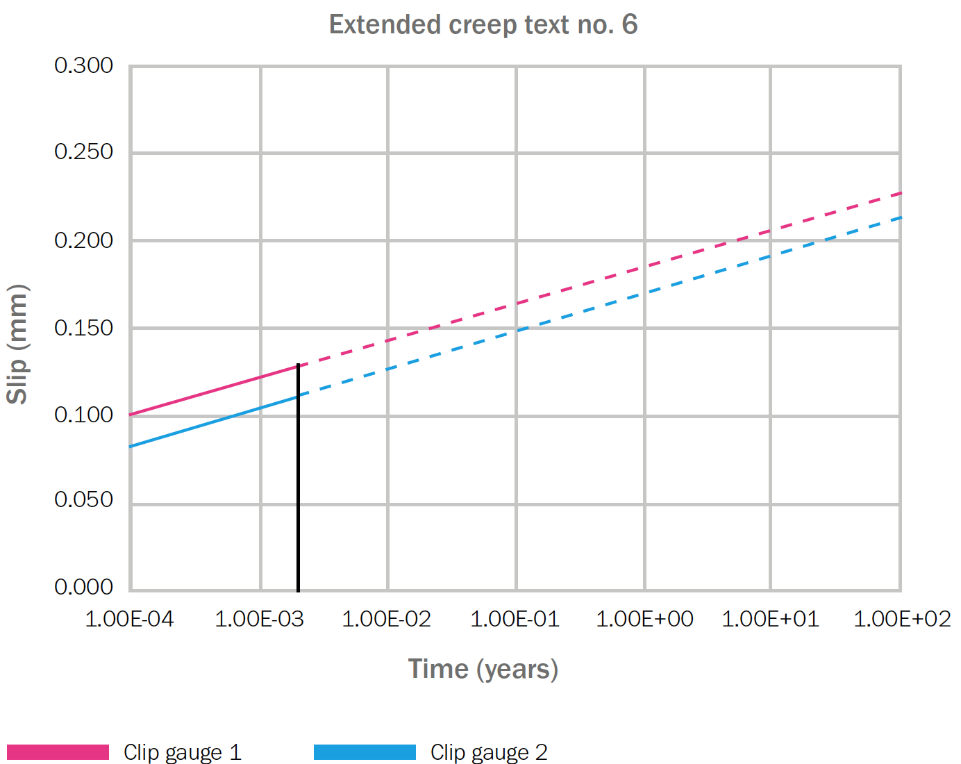 The six extrapolated slip values are all below the pass/fail criterion of 0.3 mm, even when extrapolated to 120 years.
